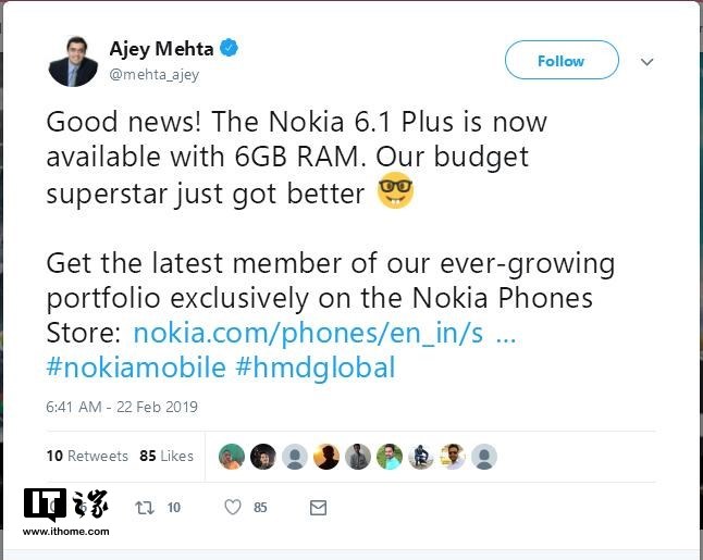 诺基亚高层Ajey Mehta在推特表示,现在诺基亚已经正式上架了拥有6GB内存的诺基亚6.1 Plus手机,现在海外消费者就可以在诺基亚商城购买到拥有6GB内存的诺基亚6.1 Plus。