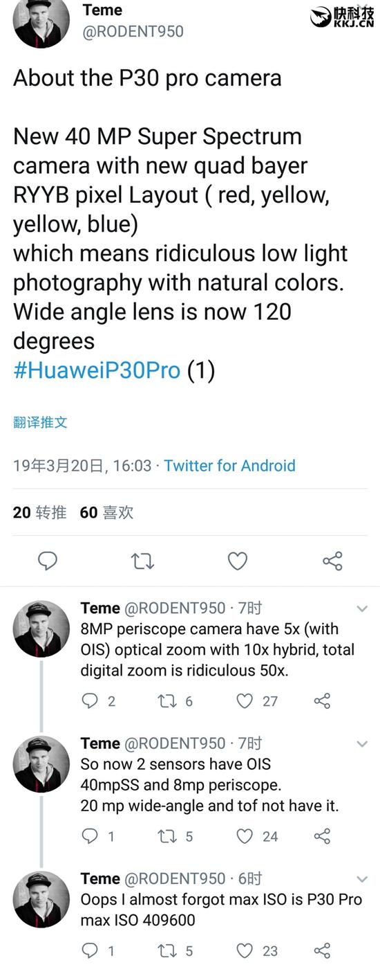 推特爆料人Teme揭示了部分细节,他透露,P30 Pro的摄像头构成是4000万像素超级光谱镜头、800万像素变焦镜头和2000万像素120度广角镜头,对了还有一颗ToF。