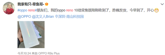 还有网友是在线上提前预约的,在凌晨付了尾款。与此同时,微博上许多早早就预定的网友,如今收到了Reno 10倍变焦版,更是疯狂晒单,艾特沈义人,表达自己的兴奋之情。